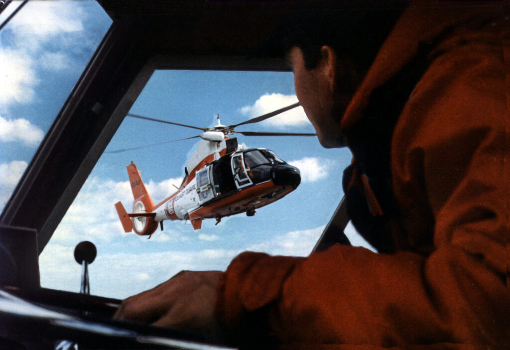 Here the Captain of this Coast Guard Vessel is talking to the Pilot of the Coast Guard Help. The pilot came down to make eye contact with the Captain while talking. The amount of spray generated by the down wash of the helicopter wash crazy causing un wanted lens flare & a mist that distorted light in all directions. This is in addition to the serious amount of backlighting that is created by the darkness of inside the vessel cockpit and the blue skies outdoor.
